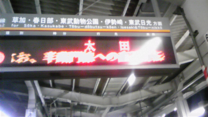 帰りの東武伊勢崎線…というか乗り換えないで済むように北春日部行きに乗ったのに「行き先変更。北千住終点です。」と下ろされて「次はどっちから出る?」とめちゃくちゃ混んでいる北千住駅の3Fと1Fをウロウロ…(泣)結果的に1Fから出る各駅停車 太田行き(区間急行→東武動物公園駅まで各駅停車扱い)に乗車…メチャ込み(泣×2)しかしホーム上LEDは素晴らしいちゃんと「太田」表示も用意してあるんだねぇ…(メモ)10日2時半頃まで自宅周辺カラスが鳴きまくる。明日天気が悪いのか??