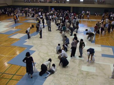 完全復元伊能図全国巡回フロア展を見に江東区の深川スポーツセンターまで行ってきました。(入場料大人500円)50歳を過ぎてから日本地図を人力の測量により作った伊能忠敬。復元された「伊能中図」「伊能大図」の上を歩いて見ることができた。(特殊加工されているようで靴さえ脱げばOK)展示されているのは3階のフロア。最初に4階から展示会場を見る。中図と大図が展示されているのだけど、大図の大きさに驚く。人がいっぱいいるので分かりにくいが、確かに現代の日本地図と遜色ないと思う。実際昭和4年までは使用していたらしい。3階に降りて地図の上を歩いて見る。「こんなところまで行っていたのか…」クナシリ島(国後島)実際は忠敬は行かずに、指導を受けた間宮林蔵が測量を行ったらしい。(ただ、忠敬と林蔵は会った記録はあるが短期間で測量技術を会得したかは謎らしい?)この他にも伊豆七島にも測量に出かけ(忠敬は健康に配して同行せず)青ヶ島の地図を作っている。すごいよなぁ…一番人気の地図(エリア)は、「武蔵国」やっぱり自分の住んでいる場所がどう記録されているか気になるのだろう。…私もそうです(笑)江戸時代からあったんだねぇ…なんか感動したよ。