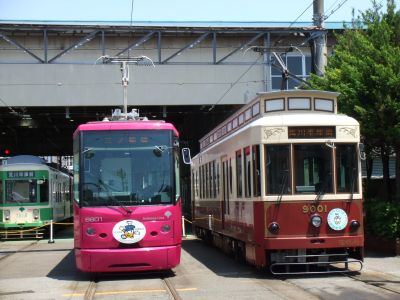 東京都交通局荒川電車営業所(都電荒川線の車庫)で開催された「2009路面電車の日」記念イベントに行ってきました。普段入れない工場の中を見ることが出来たので興味深かったです。最新型の8800系の車内にはLCD(だと思う)の案内標示器があることにびっくり!工場なので…車両をトラバーサーに載せての移動実演点検中の車両(仮台車をはいています。工場ならでは…)応急作業車(軌陸車)導入当時に担当していたという方の説明が良かった。最初に導入したのが30年前。当時は、都電の線路にある急カーブを曲がれる車両が国内になく(普通、国内調達が基本。でも無かったのだから仕方ない)外国の車両を導入することになったんだけど…「東京都」ですから大変苦労をされたとのこと。「ミニ」プロジェクトXみたいな話でしたね。都電荒川線と言えば…史絵さんでしょう?(笑)史絵さんは「鉄道映画女優」として活躍中。また、都電荒川線を応援していることでも有名です。今日のイベントでも、子供対象の工場見学の説明役をされていました。「あ…史絵さんだ!」と工場裏手でミニ撮影会状態になっているとこ発見。こっそり…(<おいおい!(爆)))撮ろうとしたところ、気がついてくれて目線までくれました(感動…いい人だ…(喜))他に都電グッズなども買って十分満足して会場を後にして…都電1日乗車券(400円)を使用していたので無料入園の優待があるあらかわ遊園へ移動(荒川車庫前→荒川遊園前)特別珍しい動物がいる訳ではないのだけど、ここの動物園好きだ私。これは動物ではないです。あらかわ遊園のマスコットキャラクターの「ユウくんとミミちゃん」です。ミーアキャットがモデルだそうです。1日暑かったけど楽しかったなぁ…(おまけ)工場内に古い車内中吊り広告がいくつか展示されていました。その1枚。緒形拳さんがモデルになっていますよ~若いぃぃ…