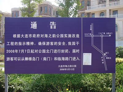 単独行動の日(笑)しかし、出だしからつまづくとは・・・観光客向けの市内バス路線「旅游(王不)路」。ネットで調べてみると大連火車駅(立占)が起点。8時から17時まで30分毎に運転。(有る程度乗客が集まらないと出発しないらしい・・・)1区間乗車は2元。1日乗車券は10元で乗り降り自由。主な観光地を巡り好きな場所で下車して観光。また乗車するシステム。切符売り場は、大連駅の観光案内所の近く専用の売場。売場へ行き、机の上に置いてある1日券を指さして「これください。」と言うと係員は×サイン。「は?売り切れなんですか?」(1日乗車券だから売り切れってことは無い)「(中国語)」なんか分からないけど売ってくれない。話は前後するけど、このバスは夜景を見るコースがありそれには問題なく乗れた。そのことも含めて考えると昼間止まっていたバスは、別の観光会社のバスで「あれに乗るなら、このチケットでは乗れない」と言われていたと思う。係員と押し問答(?)をしている時に、業者のおばさんが「こっちおいで」(推測)と案内されそうになったから。(しかし、こういう公的な窓口の側に大量に業者を置いておかないで欲しいよ。)結局、バスに乗るのを諦めた。「そういえば、海之豹公園(旧東海公園)はどうなったかな・・・?」と気になったので(それに気軽に行けるので)路面電車201路線に乗車。見ている限り大体の電車が「区間車」となっていて「興光街~華楽広場」で「海之豹公園」行きは見ない。3月来たときは車内に「華楽広場~海之豹公園は工事のため折返運転している」という案内書があったが、今回は見ない。「どうなっているんだろう?」なにはともあれ「華楽広場」まで行ってみた。結果から言えば「華楽広場~海之豹公園」は区間運転と興光街(直通運転)の組み合わせで運転されていた。電停(駅)に時刻表は無いので、どうやってダイヤを知るのだろう?私は、電停で待っていると「待っているより歩いた方が早いよ」(推測)と地元の人アドバイスにより往復歩いた。ま、途中路面電車が抜いていったのは幻ですよね(泣)「海之豹公園」は大規模な工事中。どうも工業団地か何かを建設している模様。「海之豹公園」へは、別の場所(入口)から入る・・・らしい。「海之豹公園」電停付近を歩いていると「海之豹公園へ行くなら(別の入口へ)送るよ」(推測)とおじさんがしつこく迫る。昨日の「ぼったくり」後遺症中のため(謎)「結構です。公園に行きたい訳じゃないのです」と言って逃げる(爆)来た道を戻って路面電車に乗って一旦ホテルに戻る。