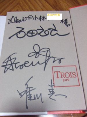 休日は、パチンコばかりしているんでしょ?…とか思われている私です。ま、98%位正解です。俺です(南まりかさんのブログ風書き出し)でも、パチンコばかりやっている訳ではありませんよ(<しつこい(苦笑))今日は、珍しく他のこともしていました(爆)朝、ネットを見て回っていると(関係ないけど「ネットサーフィン」って言葉。まだ現役?)「フライト検定」というのを見つけた。「フライト検定」とは(フライト検定公式サイトより抜粋)『フライト検定は、飛行機に関するメカニックな知識を対象としたものではなく、利用者としてフライト、そして飛行機に関する実用的な基礎知識を幅広く知る為のツールでありまた趣味の域としてはもちろん、広く飛行機を利用する方々の興味と知識を高め、より良い飛行機の利用方法とフライトの楽しさを知って頂くことを目的としています。』だそうです。第2回フライト検定は、11月15日(日)に実施。この日は「時刻表検定」も実施されるので「どっちを受けてみる?」「本来(謎)なら時刻表検定受けておくべきだろう?」…とも思ったのですが、過去に時刻表検定は受けて「俺の時刻表知識レベルは、こんなものだったか…(泣)」と思い知らされているので、今回『も』パス(爆)フライト検定の初級と中級をの両方を受けてみることにしました!秋葉原で時間をつぶしてから恵比寿へ移動。(ヨドバシカメラ内をウロウロ…(笑))有隣堂さんの主催による『TROIS』(トロア)出版記念 石田衣良、佐藤江梨子トーク&サイン会に参加。『TROIS』は、石田衣良さん、唯川恵さん、佐藤江梨子さんのリレーで書かれた小説。帯によると『それぞれ描く男女三人が、複雑に絡み合い、嫉妬と野心 官能渦巻く恋愛小説』とのこと。これから読むのが楽しみ~!トークの冒頭で、佐藤江梨子(サトエリ)さんが出版元の角川書店の担当者にクレーム。「この帯は何?私、官能小説書いてないですよ!」それに、石田衣良さん反応。「そうだね。官能部分は、私と唯川先生が書きましたね。」さらに「書いていて楽しいんだよね~官能小説とかベッドシーンとか(笑)」「実際している訳じゃないんだけど、妄想だけどねぇ…(笑)」トークの冒頭だけで、石田先生が好きになったかも(笑)(まだ、石田先生の作品は読んでいないのだ…)いや~石田先生しゃべり面白いわ~それを受けるサトエリさんが、また絶妙の返しをするんだなぁ…30分のトークショーは、あっという間に終了。その後、20分程マスコミ向けの囲み取材とフォトセッション。(その間、参加者は休憩時間)取材終了後にサイン会。係員「お名前は、石田さん、佐藤さんどちら(書いてもらいますか?)」「(げっ…結構厳しい質問だよなぁ。でも…)佐藤さんでお願いします。」私「先生トーク面白かったです。」石田先生「あっそう~そうかなぁ~(笑)ありがとう」握手してもらう。私「サトエリタイムズみています。面白いです。」サトエリさん「あー違うんだよ~(笑)サトエリタイムスだよ。」「えっ…(汗)」サトエリさん「違う違う。サトエリタイムズですよ~(笑)」握手してもらう。初めて見た実物のサトエリさん。良い意味で日本人離れしている美しい人で透明感を感じました。あと、一人一人握手した後、合掌しているのが印象的でした。で、サインしてもらった本。ハードカバーを購入したのは久しぶりだなぁ…