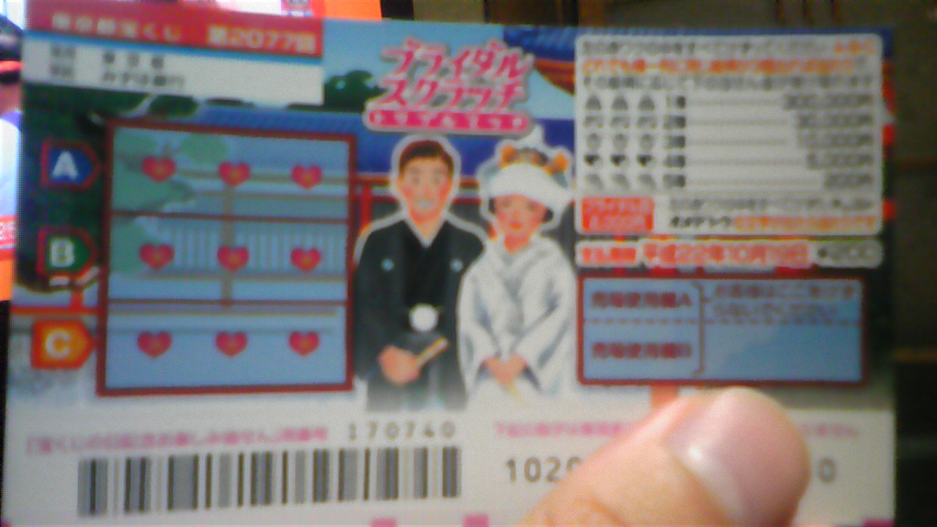 何気なく通りかかった宝くじ販売店前。このスクラッチクジに、なぜかひかれ5枚購入。ピンボケしているので読みづらいと思いますがブライダルスクラッチ(トリプルマッチ)と書いてあるのだ。なんか心が欲した(謎)としか思えん(??)結果は、5枚ともハズレ。ま…商品は、ネーミングが大事ということを身を以て経験したことで良しとする(苦笑)