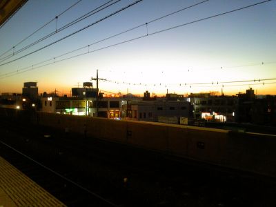 強風で、空のゴミが一掃されたのか?地元駅ホームからの夕焼けが綺麗だった。心にしみいる感じがしたよ。写真だと分かりにくいけど富士山も見えていたんだよ。