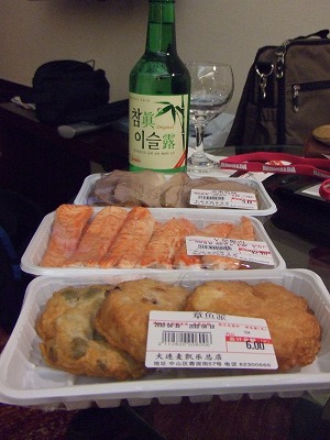 この部屋(ホテル)からインターネットが繋がらなかった。一人宴会最高潮!(爆)を迎えたところでインターネット復活。なんか微妙に酔っている状態でキーボードを打っている。前回(12月)はリニューアル工事中で入れなかったマイカルの地下一階食品売場。今日、行ってみてびっくり!かなりオシャレな売り場に変貌していました。大連お越しの際は、お土産品購入の目的も果たせると思いますので訪れてみることをおすすめします。一人宴会の品物も、ここで購入したもの。久しぶりのジンロは甘くておいしい(当然ストレート(笑))今日は買い物デーだった。大連のフリーペーパーなどで評価が高い久光に行ってみました。初訪問。ここに限らないですけど大連市内至る所で地鉄(地下鉄)の工事中。(2年後に開通するらしいです)久光の地下一階に食品売場がある。日本食品を含め生鮮品を多く取り扱っていることやその食品を自宅まで配達してくれることが特長らしいです。たしかに日本食品、生鮮品は豊富でした。でも、観光客の土産品というと弱い感じ。大連で暮らす人たちをサポートしているお店なんでしょうね。(…と言っても、ここで大半の土産は購入・笑)ホテルに一端戻る。大連駅へ行き構内の書店(本・雑誌コーナ)を覗いたけどやっぱり時刻表は売っていなかった(泣)もしかすると店員さんに聞けば調べてくれるかもしれないけど…中国話学力ないし(泣)昨日見つけて気になっていた駅構内にある真功夫(音出る注意>HP)ブルースリー(?)がお店のイメージなのか?至る所に描かれている。排骨飯が看板メニューらしい…排骨飯(排骨とご飯は別々になっている)レタスの温かいサラダ(「生野菜王」が商品名らしい?)烏骨鶏のスープ(中国語のメニューに書かれていたことを我流解釈なので、あまり信頼しないように(爆))のセットで24元。ご飯もこだわっているようでポスターによると『タイ産の香米を使っている』とのことジャスミンライスのことだろうか?さすが看板メニュー。排骨飯がおいしい。濃いめに味付けられた骨付き肉がおいしい。この真功夫。日本にあるのかな?日本に導入したら結構当たると思うんだけどな…それくらい美味しかった。駅を出てフリーペーパーで紹介されていた『きりこ屋』(順和礼品商行)さんを訪問。ホテル(ラマダプラザ)から近い。自社工場で製造しているためか?きりこ細工が10元から手に入る。もちろん細工が細かいものや大きい製品は金額も張る。でも、10元の商品でも良いものがある。要は好みなんだろうな…4品購入して115元を110元にまけてもらった。なお、値引き交渉する語学力はないので(爆)お店のおじさん(日本語できるようです)が自主的に引いてくれました(謝謝)その後は、修竹マッサージでマッサージ。今回は全身オイルマッサージとイヤーキャンドル。(2時間 198元)マッサージの途中で彼女から電話。予想より早く仕事が終わったから連絡したということ。一端切ってマッサージ終了した後に連絡。いろいろ考えたけど(謎)明日会うことにした。ちょっと残念だけど、夜に彼女の自宅へ行くのもどうかと思ったし(お母さんもいるし…)帰りにマイカルに寄って宴の用意(爆)そんな1日でした。