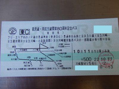 ツアーの案内券には「鶴見線踏破の旅Nightコース2号車」と書かれ【鶴見線開業80周年記念号】ご乗車のご案内と記載されているツアーに参加してきました!行程自体は単純で団体専用列車で鶴見駅を起点にして鶴見→扇町→鶴見(休憩)鶴見→大川→鶴見(休憩)鶴見→海芝浦(下車)→鶴見と鶴見線を支線も含めて全線踏破するコースです。このコース担当者はこだわったんでしょうね…これは一部なんですけど全区間の乗車券が発券されています。一番最初に鶴見駅鶴見線ホームに入場する時に「鶴見→扇町」の乗車券は使いますが他は実際には使いません…でも全区間発券です(笑)走行中の車内では改札印(スタンプ)を貸してくれて押せました。鶴見線(鶴見線営業所)だけなのかな?この改札印、スタンプもされますが穴が空くんだね。(自動改札機を通った時と同じ感じ)このツアーには記念入場券(硬券)セットと特製弁当が付いています。横浜の駅弁と言えば崎陽軒!見えるかな?シュウマイ2個入っています。大学芋が入っていて秋を感じさせる駅弁でした。私がこのツアーに興味を持ったのは鶴見線で唯一未乗区間の大川支線(安善~武蔵白石~大川)に乗れること。大川駅へ行けること。大川駅到着…ドアは開きません(泣)写真は車内から駅名標を撮影。あのーこれで大川駅訪問したことにして良いでしょうか?(↑誰に許可求めてるんだ?・苦笑)鶴見駅で約40分の休憩(!!)を取った後、最終行程へ。鶴見→海芝浦へ。夜景の写真は撮るのは難しいね(泣)これでも、いっぱい撮影した中で、まともな方なんです…(大汗)車内では、鶴見線の歴史や貨物輸送の変遷などを車内放送にて鉄道友の会貨車部会所属の渡辺さんが随時解説。鶴見線貨物回顧鶴見線が『産業遺産』とも言われていることが理解できました。扇町駅(ネコに会いたかった…)、大川駅で下車できなかったのは残念。でも、それを上回るもてなし。鶴見駅を出発する時(多分3回とも)鶴見駅長が出発合図を出していたのは手厚くもてなされている感じがして良かった。鶴見駅の受付時、弁当を受け取るのが崎陽軒の売店スタッフだったり鶴見駅には多くのスタッフが配置され、ツアー客はもちろん一般乗客へも気配りしているのが印象的でした…楽しいツアーでした!=おまけ=鶴見駅集合が16時。その前に池袋の東武百貨店へ。今、相棒=劇場版2=で杉下右京(水谷豊さん)、神戸尊(及川光博さん)が着用した衣装が展示されています(~11月3日まで)…ミッチーが細いのは分かるけど(?)右京さんも細いんですね…誰かと比較するの厳禁(大泣)相棒グッズも多数販売されているので相棒ファンにはおすすめ~