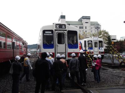三陸鉄道応援ツアー2日目ほとんどリアルタイムでTwitterで呟いていたのでそちら参照してください…っていうとブログ読んでくれている方々に失礼なんで(汗)写真多量でご紹介します。朝、ホテルでバイキング朝食(「いくら」「焼鮭」があるのが「三陸に来た」という感じがして良かった)ロビーに集合して大きな荷物をバスに乗せて身軽な恰好でホテルから歩いて三陸鉄道の北リアス線運行部へ。車両基地もある北リアス線の本部。ここでは出区点検と車掌の体験をした。車内で三陸鉄道の方(三陸鉄道発足前から所属=様々な職種を経験し知識豊富な方)から貸切車両の中で三陸鉄道の歴史や鉄道知識、出区点検方法などを簡単に受ける。2班に分かれて出区点検体験(体験と言っても本格的なもので最初の班(写真に写っている班)は時間オーバーとなり次の班(=私入り・笑)は簡単になってしまった…(笑))車掌体験としてドア開閉(ツアー参加者には「本職」もいるので結構「それはダメだろ~(笑)」という邪魔…もとい本格的な場面を実演してくれて…おかげで私すごい顔に…消去しようかしらん・汗)各種体験を終えて貸切列車に乗り込み「あれ?これはもしかして…??」貸切列車は車両基地から出発!(…これって普通だと出来ない体験=ツアー参加者=鉄道ファン→大興奮・笑)久慈駅に入線、出発(運転方向も変わる)車内では車掌体験として車内放送体験実施(希望者のみ)木村裕子さんによる『車内販売案内放送』(以前本当にバイトしていたので本職・笑)を皮切りに様々な鉄道事業者の車内放送(中には本職もいたとか?いないとか?・笑)が流れる。現在の北リアス線の終点「陸中野田駅」にて折り返しまで暫く休憩。この間、貸切列車は下り線(久慈方向)に転線を終えている。…ここで鉄道にちょっと詳しい人なら「あれ?単線なのに転線必要なの?」と思った人がいると思う。私もそうでした。そこで各種体験から引きつづき同乗していただいた三陸鉄道の方に聞いてみました。(あ、陸中野田駅の線路構成は1面2線です…分からない方は、周りにいる鉄道好きに聞いてみてください~)「上り方向(宮古方面)に下り方向の出発信号が無いから転線させているんです」とのこと。「あ、なるほど…」と思ったと同時に安全を守るというのは大変なんだな…と同時に思いましたね(素人の私としては、この非常時出発信号機(の役目)は他の方法でも対応できそうとも思いましたが・汗)駅に付属している売店にて野田名物の「塩」を使った「塩ソフトクリーム」を食べたり車内補充券(実際に使用しているもの!)発行体験(専用パンチで穴も空ける!)していると11時17分になる。久慈から到着した定期列車。乗客下車完了後、転線作業開始…貸切列車(写真右)と併結!2両編成となった車両は陸中野田11時40分発の定期列車55Dとして久慈駅へ向かう。久慈駅到着後、定期列車の乗客は下車(当たり前ですけど…汗)私達ツアー参加者は行きと同様に、そのまま車両基地へ(回送ってことになるんですかね…笑)車両基地到着後、弁当が配布され昼食タイム(ちょっと短かったけど進行上仕方なし…)色々特別な体験をさせていただいた三陸鉄道に感謝しつつ北リアス線運行部を後にする。ホテル前から貸切バスに乗り込み北リアス線の小本駅へ。(移動中配布された名前入りの「三陸鉄道車掌体験修了証」)小本駅14時10分発の16D列車に乗車。昨日北リアス線(宮古駅→田老駅)に乗れなかった変わりの対応…とのこと。いや、この配慮嬉しかったな…14時30分田老駅到着。昨日は防潮堤から見たけど、今日は反対(ホーム上)から壊滅的な被害を受けた田老の街を見る…被害の大きさに再度驚くとともに昨日は気がつかなかったのだけど、高台に立っている家は(見た目は)何も被害を受けていない。海からの距離を測った場合、その差はわずかに見えた。「このわずかな差が被害の大きさの差?」昨日とは違う感じで津波の恐ろしさを感じた。田老駅前から再び貸切バスに乗車し今回最後の目的地岩泉駅!駅舎は意外と言っては失礼なんだけど大きくてびっくり!この駅を訪問しようと列車本数が極端に少なくて大変。また、今は土砂崩壊の影響で運休中(バス代行実施中)なので列車で訪問することは出来ない状態。…訪問出来て嬉しかった!最初は「アイドル&鉄道ファンのツアーでしょ?大丈夫かな??」と不安があったのですが、私のような初参加の方がツアー参加者の半数だったこと。ツアーを裏方的に支えていたJTBの添乗員、裕子さんのマネージャーさん。あと木村裕子ファンも何気にツアー初体験者に気を遣ってくれたり、ツアーを盛り上げてくれた。(でも、少々変わっているかも?かも?…笑)そして、このツアーの企画者木村裕子さんも参加者に楽しんで貰おう(&自分自身もですよね?・笑)という気持ちが伝わってきて楽しいツアーになりました。…また、参加しちゃおうかな?ほぼ最高齢に近かったけど(苦笑)本当皆さんお世話になりました~ありがとうございました!