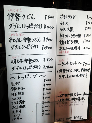 今日のお昼ご飯(・・・なんか段々「OLさんブログ」風になっていないか?(汗)伊勢うどんが食べられる珍しいお店「BAR CHI-KYU」メニューを確認『辛口カレー伊勢うどん・・・?』伊勢うどんというのは、柔らかい太い麺に醤油味の少量の出汁がかかっているものじゃないのかい?でも、カレーも食べたい気分だったので辛口カレー伊勢うどんと卵かけご飯セットを注文。注文して、ほどなくうどん到着。麺が見えません~かつおぶし、ねぎたっぷりです!あ、目の前にテキーラが映っていますが、飲んでいませんから(苦笑)それは、そうと箸を丼に沈める感じで、うどんを引き上げる。相変わらずの独特の柔らかい麺です。辛口と書いてありますが、少し辛味がある程度。うどんとカレーが良く合っていて美味しいです。うどんを食べ終えた後・・・カレーが残っているところに、ご飯と卵を投入。よく混ぜる・・・まるで大阪の自由軒のカレーみたいだ。辛口カレー伊勢うどんだ時は、卵かけご飯セットも頼みましょう!美味しかった~