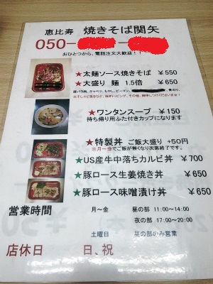 事務所から結構歩いたとこにあったお店。本当は、別のお店が目的だったのですが「行列」だったので、別のお店を探していたところ見つけた。通りに出ていた黒板を見ると「焼きそば専門店?でも、弁当もやっているみたいだし・・・」お店は「恵比寿 焼きそば関矢」さん(リンク先はお店のFacebook)「メニュー」持ち帰りがメインみたいですが店内で食べることも出来ます。「焼きそば大盛り。目玉焼き乗っけてください」注文してから暫く待ちますと・・・ビジュアル最高~!(笑)目玉焼き、黄身は固焼きと半熟の間くらいでいいです。麺は、ちょっと変わっていて平たく太めな麺。キャベツや肉などの具も多めでした。美味しかったです。しかし、恵比寿って本当色々なお店がありますなぁ・・・