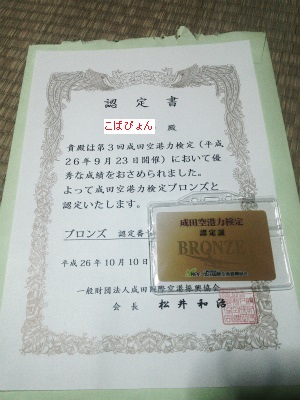 9月23日に受験した「第3回成田空港力検定」(その日のブログ)の結果が送られてきました。70問中49問正解・・・正答率70%という結果で「ブロンズ」を獲得・・・表彰状と認定証です!でも、本当ギリギリというかラッキーというか・・・「ブロンズ」の認定基準は「70問中49問以上の正解(正解率70%)」ですからギリギリ合格。そのうち1問は問題に不備があったようで全員正解の措置が取られたとのこと・・・これなければ不合格でしたよ(汗)こういう「認定証」をもらったの久しぶりですねぇ~ちょっと嬉しいかな(笑)多分、来年は出題が難しくなると思うんですよね。去年の「第2回」は結果散々でしたし・・・よく考えて「第4回」を受けるか決めたいと思います。(検定試験の後の「空港見学会」が楽しいから、また受けるような気がしますが・・・笑)