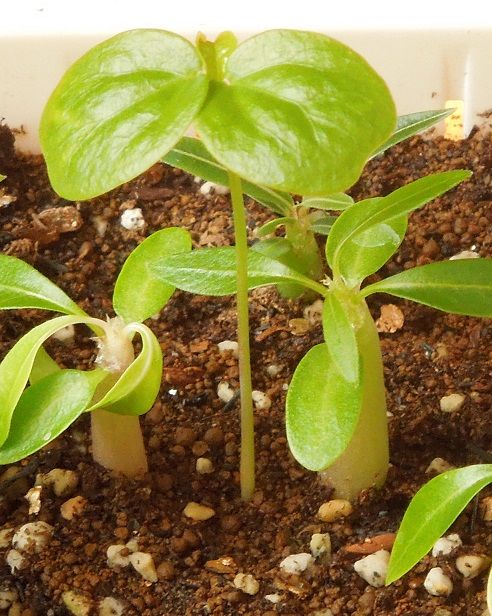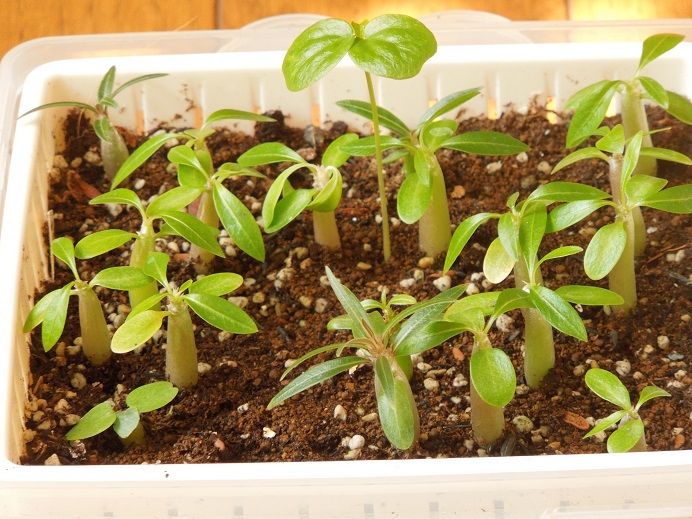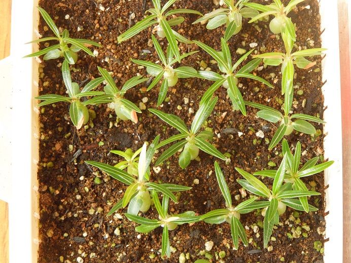 パキポディウム・バロニー、ビカラーとして輸入した種ですが、バロニーは種の形が全く違い、ビカラーも信用していいのか悪いのか・・・発芽後2か月半くらい経ちましたがこんな感じです。