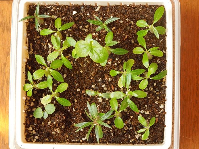 葉が細いものが3本あります、ミックスの種だったみたいです。発芽率はどちらも70%くらいだったのでまあまあだと思いますが・・・