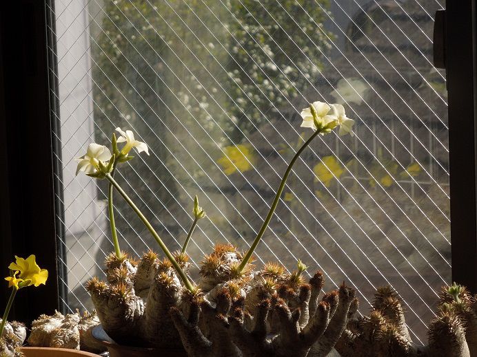 Pachypodium brevicaule & eburneum in bay window is blooming well.