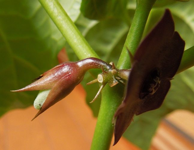 マタレアシクロフィラが結実したみたいです。2本有り、毎年同じ時期に開花しているのですが、開花3年目にした初めてのことです。花の構造、雄しべも雌蕊も良く分からず、それとも雄花と雌花が有るのかもわからず放置していました。どなたか、マタレアシクロフィラの花について知っている方が居たら教えて下さい。 It seems matelea cyclopylla has fruited. There are 2, they are flowering every year same time but it is the first time. I don't know structure of the flower, there are male flowers and female flowers are present or not. Please tell me if know about matelea cyclophylla flower.