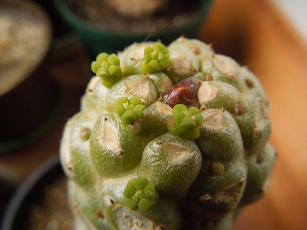 先日頭頂部に緑色の突起が出てきて葉芽かと思っていたら花でした。