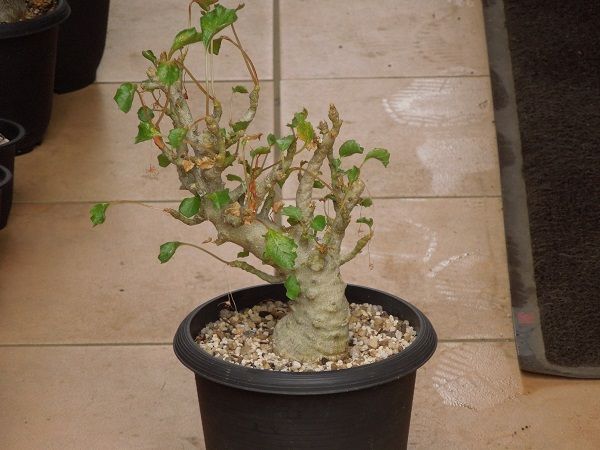 まだ一度も花が咲きません。太い枝(鉛筆くらい)にならないと花が付かないそうです。聞くところによると、早いものは実生3~4年で開花させたそうです。大きめの鉢で肥料に鶏糞、冬季も加温して育てたそうです。