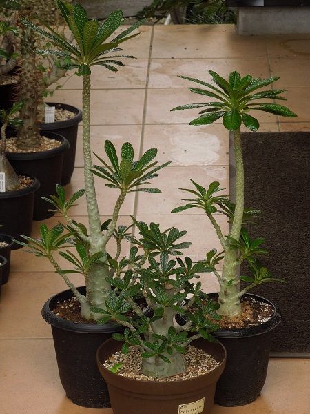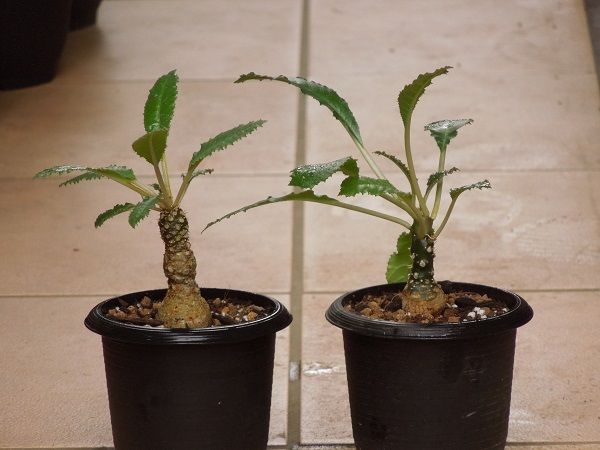 茶色の鉢が初めてのドルステニア。手前右が葉の大きな葉のドルステニア(名前忘れました)、水遣りを忘れるとすぐに葉が萎れるのでふつうの草花のように水を遣っています。
