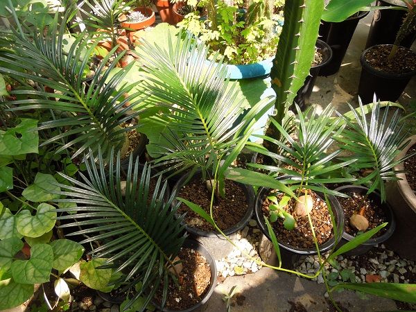 こちらは春に植え替えをした蘇鉄、鉢底から根が出ているものも有り、このまま放置の予定。