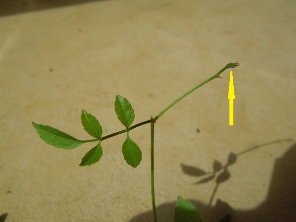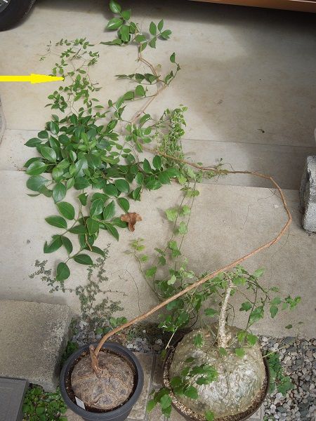 今年は今までで一番蔓が伸びている、4mくらい有ると思う。矢印は切った先端部分。右側の太い部分を残して屋内に取り込むことにした。今までで一番長く蔓を残してみた、来年はどんな新芽の出方をするか・・・