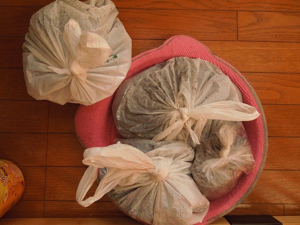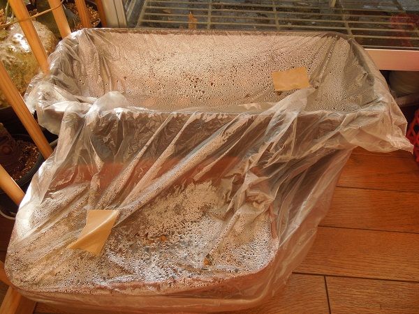 最後にプランターと袋に蒔いた種はこんな感じでリビングの床暖房の上に置いてある。