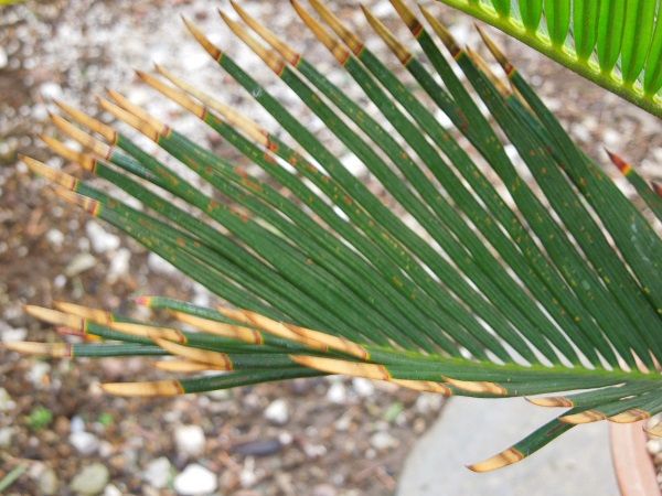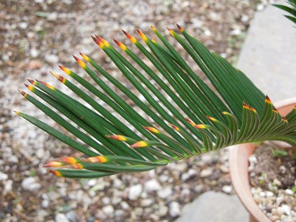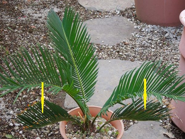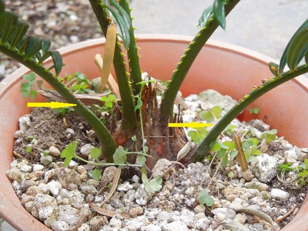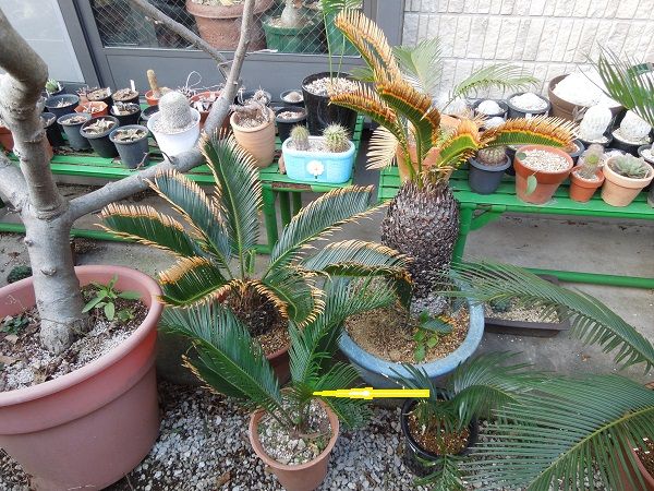 「5~6月に新葉が出て、7~8月に葉先が色づき始める」と、どこかに書いてあったような気がする。昨年届いた金環蘇鉄と一緒に置いて気長に様子を見てみよう。
