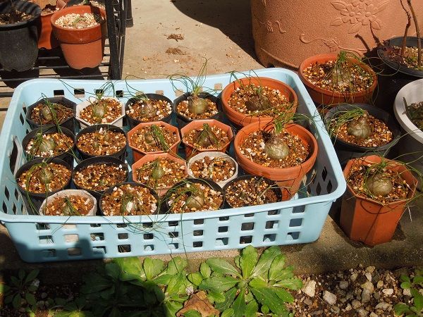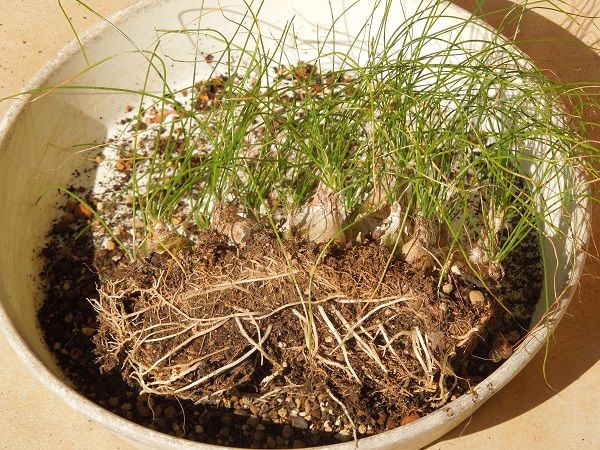 アルブカフミリスだったと思う。球根が増えて育ち用土が盛り上がっていた。花芽が上がってきているものもあったが植え替えることにした。