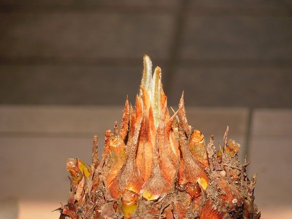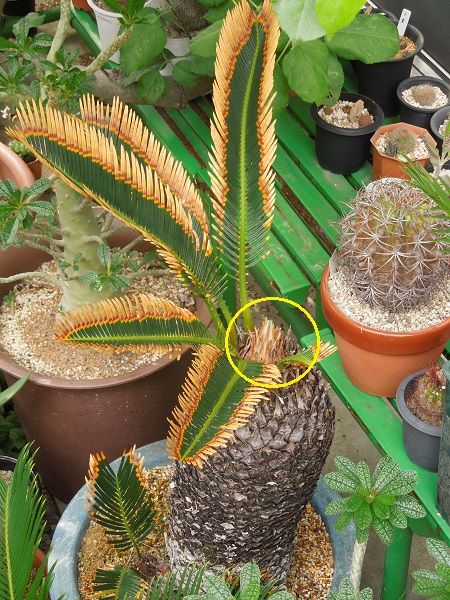 ディオーンスピヌロスムに遅れること約半月、普通のソテツも新芽が出てきた。