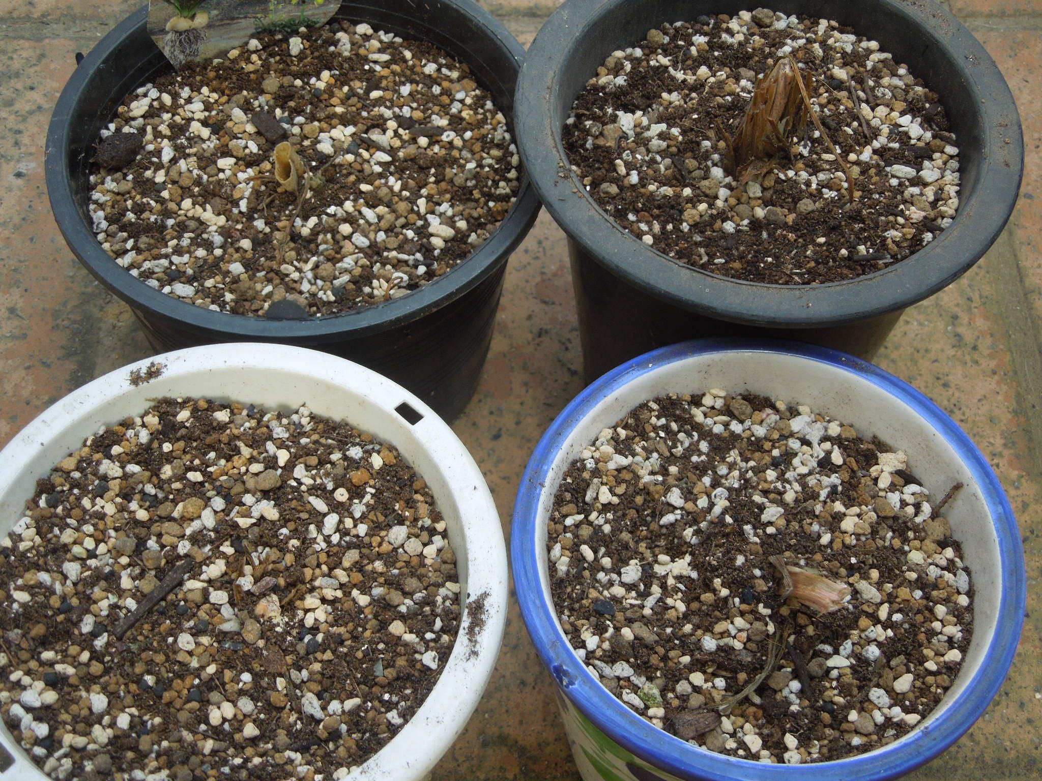 有り合わせの鉢に植え付け、玉ねぎはほとんど土に埋め込んだ。