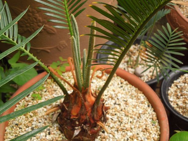 先月新芽を出したが途中で枯れてしまった金環蘇鉄は、再度新芽を出して順調に伸びている。