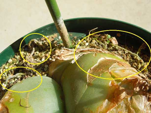 鉢の淵から根が飛び出している。