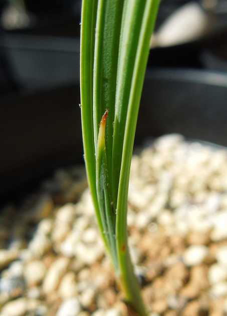 先日袋蒔きで発根していて植え替えたブラヘア・アルマータの葉が出てきた。