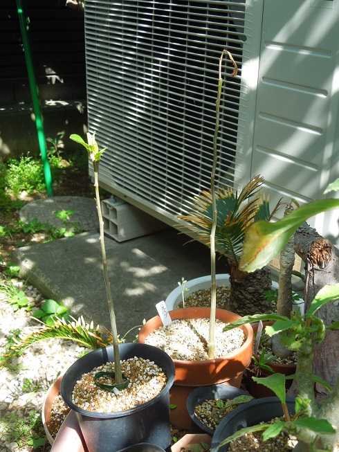 先月末から屋外に出したバオバブ(中央・左はアラビカム・ブラックドラゴン、右はアラビカム・クイーン)も動き始めた。