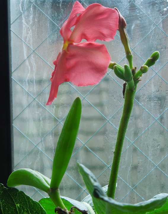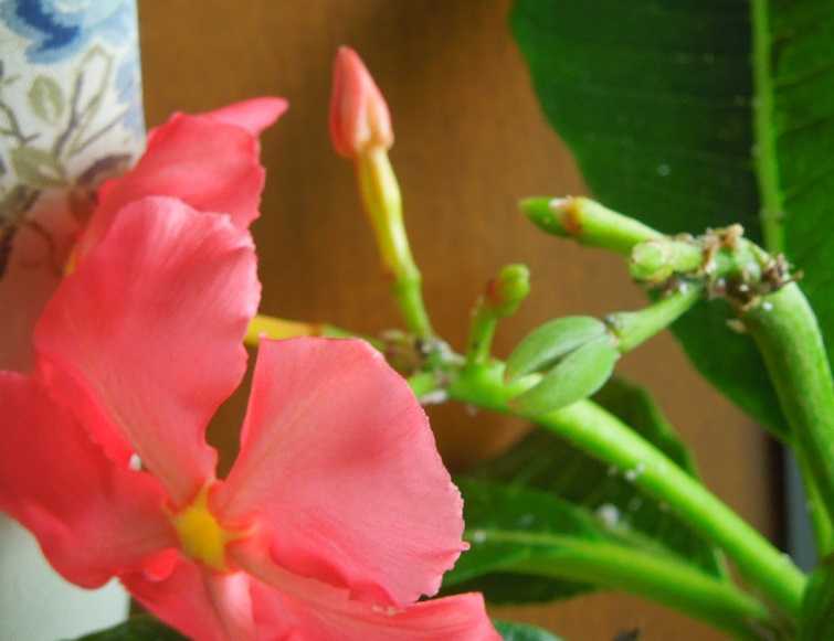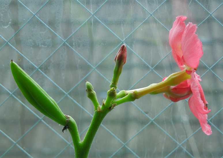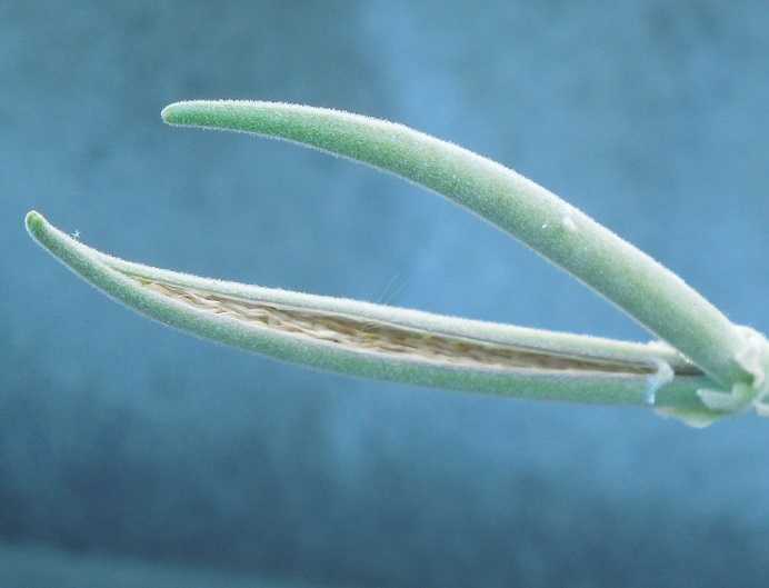 我が家のパキポディウム(エブレネウム・イノピナツム・えびす笑い)は莢が緑色のまま割れて、翌日くらいには完全に開いて種は風に吹かれてどこかに飛んで行ってしまう。
