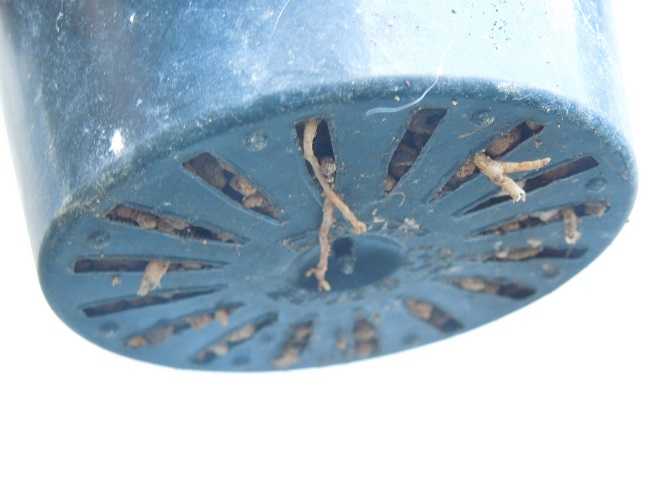 自宅に帰り鉢底を見たら根が出ているので植え替え。