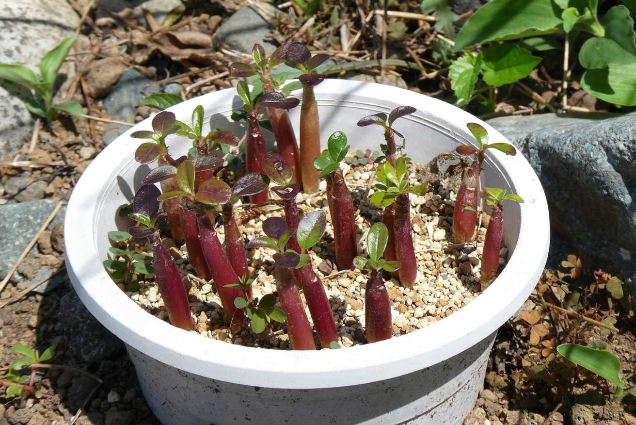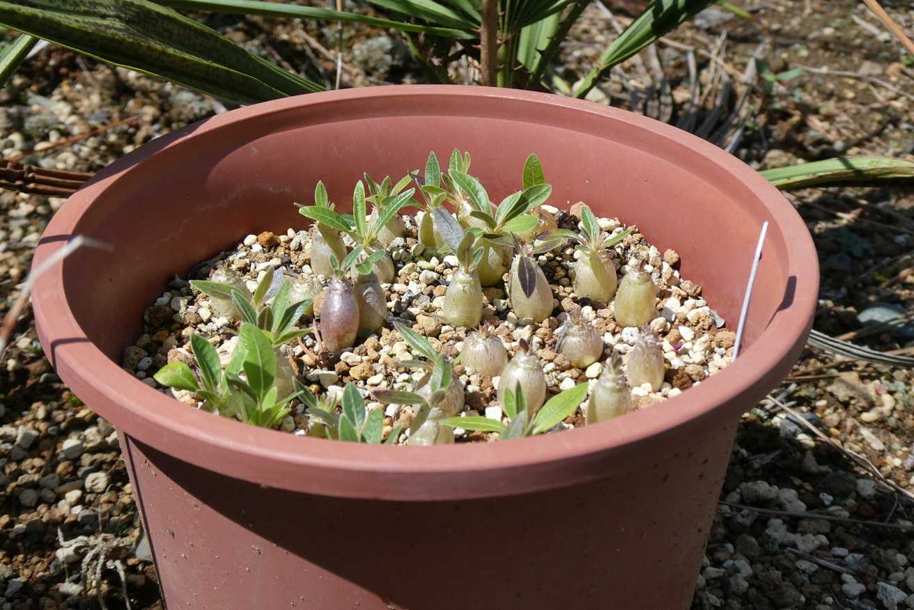 鉢のまま、少し埋めてあるパキポディウムの実生苗は・・・
