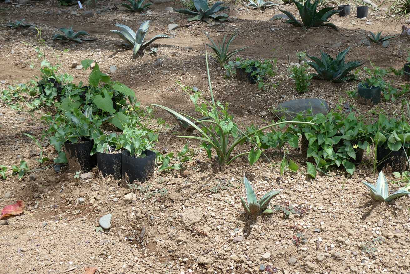 畑に鉢の4分の1くらいを埋めたイベルビレア。