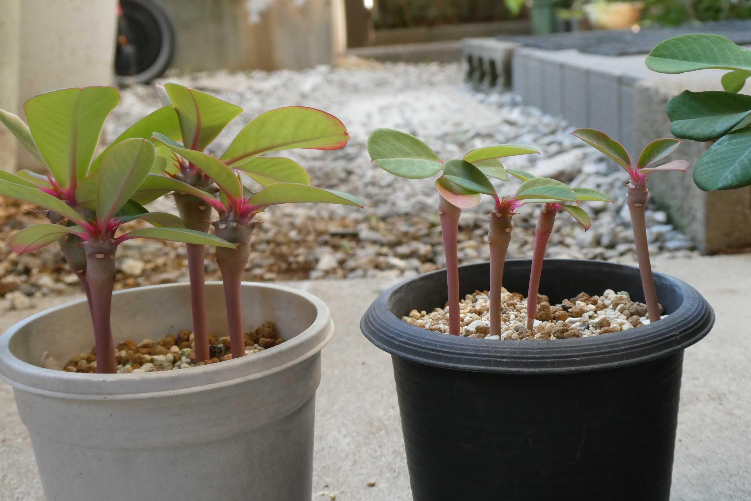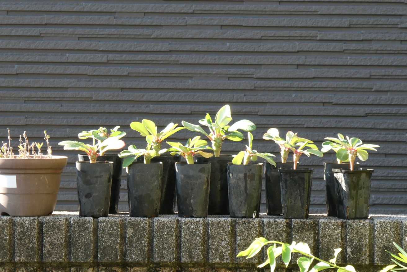 肥料(マグアンプk)を入れた鉢に蒔いた種、肥料無しの鉢に蒔いた種。