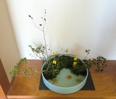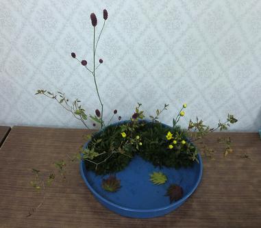 秋の訪れが遅かったので、急に涼しくなって身体がついていかずに風邪をひいている人も多いですが、最近は平年並みの気温です。いつまでも半袖を着ていたせいもあり、例年は今頃は何着ていたっけと考えながら、街行く人の服装を参考にしたりして明日・明後日は10月の支部研究会です。秋の写景(自然も様式も)や琳派調、菊の色彩様式までバラエティに飛んだ今月の研究会です。私たち1級○専の課題はつつじ、吾亦紅、小菊、立日陰、紅葉「秋の散り紅葉の写景様式」です。女郎花と竜胆が入る基本取り合わせではありません。お教室で撮った写真です。きょうの材料は、つつじがほぼ枯れていて葉がボロボロ落ちている状態で、整理しなくても程良い葉の分量になってよかったのですが、家に持ち帰ったらもっと落ちていてかなり少なくなってしまいましたも余り良くなかったです。研究会ではきっといい材料が来るでしょうもう少しいい作品がお見せできるといいと思います。でも、丸水盤で散り紅葉というのはなかなか大変です。こっちも見てね 「おばさんのつぶやき」 ブログランキングに参加しています。 きょうもポチっとお願いします