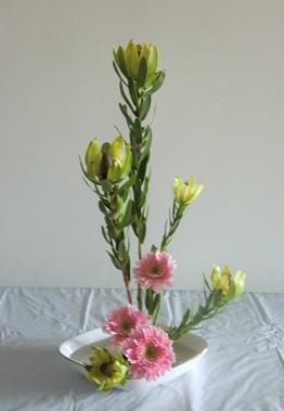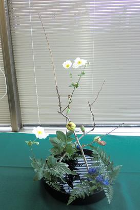 昨日の日曜日は、本部主催○専研究会でした。今年は、小原流研究院相談役・関 邦明先生と研究院講師横川郁子先生をお迎えして、新花型の「花奏」を、午前・午後の2回に分かれて約150名ほどの○専の先生方が勉強しました。まずは、展示花 今回私たちが勉強した課題は連翹3、鶏頭3、小菊3、木苺3(丸水盤)と 向日葵3、ユーカリ2、ブバリア5、レザーファン3(まどか)のどちらかです。 私がいけたのは客枝をブバリアにして、主・副・客違う花材にしました こっちも見てね 「おばさんのつぶやき」 ブログランキングに参加しています。 きょうもポチっとお願いします