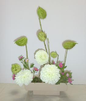 10月に入り、すっかり秋らしくなった仙台です。9月の残暑の厳しさに「涼しくなった~」と思ってしまっていますが、平年よりは暖かいそうです。お花はすっかり秋の花材になっています。きょうは、本科勉強中のHさんも含め、皆さん風船唐綿、ダリア、ミニアスター「花意匠・ならぶかたち」をお稽古しました。 本科勉強中で、今月本科のお免状を申請するHさんですが、初等科からずっと「たてるかたち」と「かたむけるかたち」を重視してきていたので、カリキュラムにあるのに「ならぶかたち」は初めてでした。なんと、今月の本科の研究会課題は「ならぶかたち」。今月申請だから本科で出席は来月だから良かったけど、一度も教えないまま研究会課題になったら大変と言うわけで、お稽古になりましたそれ以外の方々は、同じ「ならぶかたち」でも、花材の量ももったいないので、大きくいけるために花意匠新型花器を使っていけました、正面性ではありますけど。 長めにいけていたSさんは花器を少し離してあげました。アスターの色が可愛くて、白いダリアもなかなか良かったです。こっちも見てね 「おばさんのつぶやき」 ブログランキングに参加しています。 きょうもポチっとお願いします