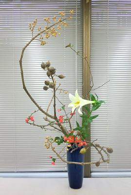 週末、11月の支部研究会がありました。前のブログでご紹介したように、今月は小原流研究院講師・平出仁穂先生のご審査です。本科クラスといえどもきちんと入っていないと95点はいただけなかったようで、95点は余り多くはなかったですが、本当にいい作品には100点もくださるという、なかなかメリハリのあるご審査でした。講評も分かりやすく的確でした私は…といえば結果は90点で、85点も続出の中、良かったといえばよかったのですが、反省しきりですこれは家でいけたものですが、この枝は折れているのではなく、こんな風に曲がっていたのです。そして口元でまた変に曲がっていて、枝は足さないと足りないくらいなので、曲がっているからといって切ってしまっては短くなる…ということで、悪戦苦闘で主枝を留めるだけで30分くらい?かかってしまいました。上の写真で下のほうに入れている実は、実は主枝の付き枝でした。採点終了後に入室して自分の花を冷静に見た時、主枝が枝もなく1本になっても良いから、実付きの枝を切って、別にどこかに使ったほうが良かった…と思ったのです。それで、家でいけるときにやってみたわけです。そしたら、主枝もすぐに留められたんです付き枝で重心のバランスが悪くて留まりにくかったわけですなんということそれに気がつかなかった自分にショックで…まだまだ修行が足りません。昨日は3軒ほど病院や接骨院などをはしごしていたら1日が終わってしまい、きょうの午前中にやっといけたのですが、それから落ち込んでいましたこっちも見てね 「おばさんのつぶやき」 ブログランキングに参加しています。 きょうもポチっとお願いします