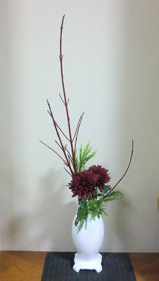 きょうから11月です今年もあと僅かになりましたね。11月の声を聞いたとたんに寒くなり、朝の最低気温は10度を切り、日中の最高気温も明日は13度の予想です今朝、お掃除をしながらふと思い立ってホットカーペットを出して絨毯の下に敷きましたまだファンヒーターを出していません灯油も買っていないし11月最初のお稽古です。きょうは出席率が悪いです遅く来てお花だけ持って帰られた方もいます。本日のお稽古は赤芽柳、竜胆 を使いました。 本科のHさんは、今月初めての本科クラスの研究会に出席しますので、来週の研究会のお稽古の前に、今週も課題である「かたむけるかたち」の練習それ以外の方は秋らしい色のスプレー菊 もプラスして盛花です。 こちらはTさん。同じ赤芽柳でも秋色になった紫陽花とドラセナ でおしゃれに仕上げた作品は、一昨日にいらしたSちゃんの作品です。 こっちも見てね 「おばさんのつぶやき」 ブログランキングに参加しています。 きょうもポチっとお願いします