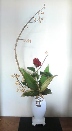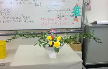 12月の支部研究会が1日、2日なので、今月末(来週)にお稽古をすることになり、そのため今週はお休みなのですが、お仕事の都合で変則にいらっしゃるSちゃんのお稽古をしました。お仕事の都合で研究会に行きにくくなり、今Sちゃんは支部休会中なので、研究会のお稽古をしなくても良いのですが、12月の3級の課題は可愛かったので、来週みんながお稽古する課題の花材を花屋さんに用意してもらいました。コキア3、スプレー薔薇2、ミリオクラダス少々、霞草少々「花意匠・まわるかたち」コキアは立てて使って、その他の花材でまわしていくというのがポイントだと思います。後ろのボードを持ってくれている可愛いお手てがいつも一緒に来る2歳のMちゃんです。こっちも見てね 「おばさんのつぶやき」 ブログランキングに参加しています。 きょうもポチっとお願いします