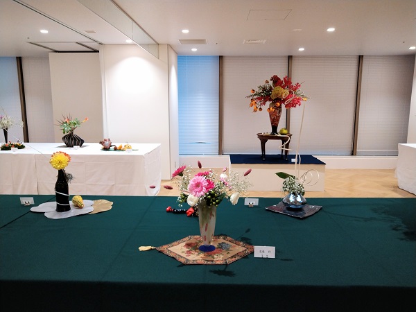 会場はいつも支部研究会を開催している場所で、ビルの地階なのですが、1階のエントランスホールには、東側、西側それぞれの入り口に支部長先生と副支部長先生の迎え花が展示されました。