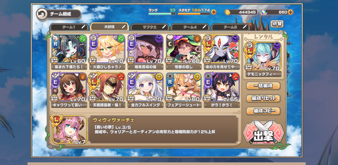 モンスター娘TDイベント、今秋から大討伐が追加されましたモンスターの討伐累計数でインプ娘のラミがもらえるので狙いますさっそく挑戦しましたが難しいです敵の数が300体ともの凄い物量!難易度ノーマルでも厳しい展開でしたお次はハードの500体、こっちはすごく苦戦した何回も再挑戦し、攻略wikiやyoutubeを参考にしてどうにかクリア出来ましたこれがクリアした時の編成ですアリスフィーズとレンタルのラピスが大活躍でしたハードよりさらに上の難易度EXもありますが、もう無理です現状はハードが限界だと思い止めておきますとりあえず欲しかったインプ娘のラミは手に入ったので良し