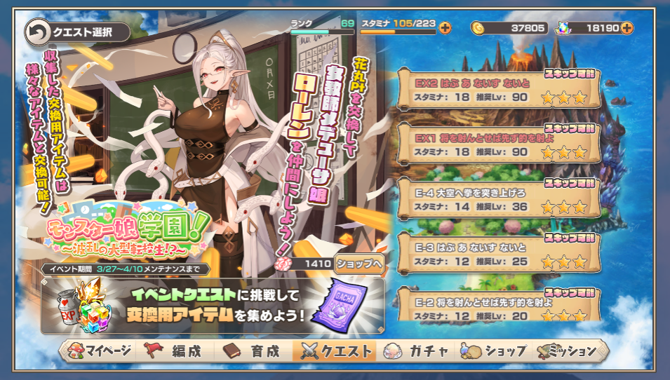 昨日から新イベがスタートその名も『モンスター娘学園!』ですイベントクエストをクリアして交換アイテムを集めるまあ、いつものやつですね交換で貰えるモン娘は『女教師メデューサ娘 ローレン』他にもEXPミルクや各結晶など育成に必要なものが色々手に入るので、出来る限り全部取りたいです一応、前半戦のクエストはEX含め星3クリア出来ましたとくに難しくなくてよかったストーリーはスキップしているので読んでないっすさあ、頑張ってイベント周回しましょう!