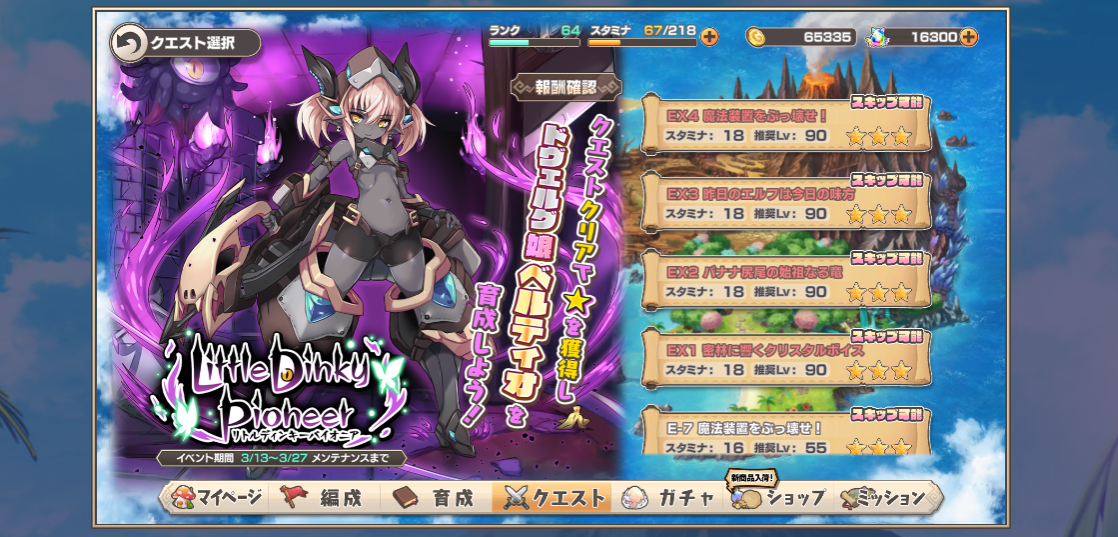 イベントのEX2、クリアできたYoutubeの攻略動画様、ありがとうございます来週、イベントの後半が開始されるまでは他の事に専念できるというわけで、メインクエストを難しくしたスペシャルチャレンジに挑戦3章まではすでに終えていたので4章から始める意外とあっさりとクリア出来て5章にもチャレンジところが5-6で詰まってしまったなんどやってもハーピィを打ち漏らす遠距離系を増やすと地上の壁が破られて失敗どうすりゃいいのよ・・・とりあえず、出来る所からやるとして獣神・ニーズホッグのスキルを最大まで上げますかそのためにクエストを周回をして素材集めだ