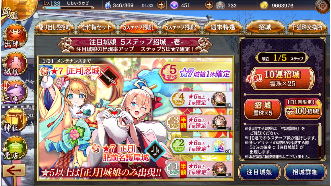 新規の城娘が39体、そのうち[正月]城娘は13体でした
