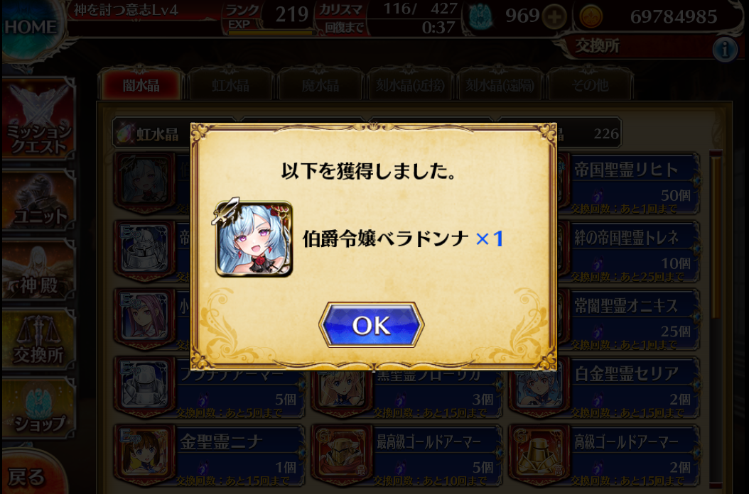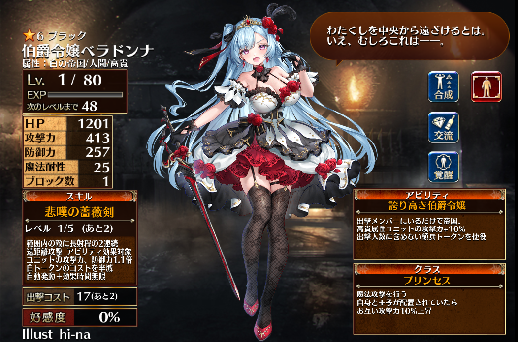 闇水晶で交換入手出来るのが「伯爵令嬢ベラドンナ」