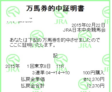 ど~~もです。今年3度目のカキコです。ところで、前回カキコしたフェブラリーSでは、見事にやりました。アイ・ゴット・ファーストマンバケン・イン・2015!!それから1ヶ月後・・・マイブログの久しぶりにアクセス記録を見ると、毎週カキコしていた去年よりも、基本的にG1のみカキコしている今年の方が、1日当たりのアクセス数が増えているのは何故だろう・・とか・もう、つい先ほどオリジン弁当を買いに行くときに、桜並木を通って、春だな~~とか・・とまぁそんなこんなことを考えているような気がする今日この頃ですが・・今年3度目のカキコ対象レースは、高松宮記念ですか。ダートG1では、何度もマンバケンゲッツしているのですが、芝G1でも何度もマンバケンゲッツと行きたいところです。■高松宮記念(中京 芝1200M G1)有力馬の単勝オッズの動向をチェックしていたのですが、1番人気の馬がコロコロ入れ替わっていて、香港の馬が1番人気だったのですが、今では去年の春秋のスプリントG1でそれぞれ3着・2着と堅実な結果を残している、ストレイトガールですか。こんな感じで上位人気の4頭は入れ替わっていたのですが、昨年の覇者のコパノリチャードはずっと5番人気。で、この馬のジョッキーは武豊さん。ってことは・・マイブログの法則が発動?それでは予想を披露◎ダイワマッジョーレ(13)前走の勝ち方も強かったし、一昨年のマイルCSでのマンバケンを始めとし、マイ馬券にも貢献してくれているし、昨年の覇者コパノリチャードに騎乗していたのが、ミルコデムーロさんで、今年はこのダイワマッジョーレに騎乗。コパノリチャード連覇ってことも考えたけど、5番人気での武豊ジョッキーなので、4番人気以下の武豊は来ないというマイブログの法則発動で、ジョッキーの連覇を予想の軸にし、今回、マイ◎馬に指名しました。〇エアロヴェロシティ(4)現時点で1番人気のストレイトガールが3着だった、昨年暮れの香港スプリントで優勝しているし、香港から送り込まれた最強の外敵でないかと思う。ただ今回は逃げ馬や先行馬が多く、この馬も先行馬なので、ハイペースになった時は、ちょっと不安かなと思い、〇にしました。▲サドンストーム(6)カキコ現在12番人気だけど・・前5走の戦績を見ると2着2回を含めて、すべて掲示板圏内と安定しているところで、他の有力馬を押しのけて、三番手のマイ▲馬の称号を勝ち取りました。あとは結果での上位を勝ち取ってほしいです。その他△1.ストレイトガール(18)△2.ミッキーアイル(16)△3.コパノリチャード(17)★レッドオーヴァル(9)買い目(3000円予算) 3連複フォーメーション 13-4・6・18-4・6・9・16・17・18(12通り) 3連単フォーメーション 4・13⇒4・13⇒6・9・16・17・18(10通り) 馬単ボックス 4・6・13(6通り) 枠連流し 3-7・8(2通り)人は逃げれば道は一つしかない。それは「逃げ道」という道。。でも競走馬は逃げ切れば、その先に栄光が待っている。。今回のメンバーでは逃げ切るのは難しいだろうな~~では、お次は2週間後の桜花賞。See You Later!!