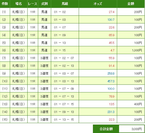 お疲れさんです。ケイバ予想は、なつやすみで、秋くらいに復帰しようかなと思ってましたが・・学校の夏休みの途中で出校日があるのと同じで、夏ケイバも1コ位は、カキコしろよという雰囲気を感じなくもないこともなくもなかったりする気もしないでもない今日この頃なので、ジスサンデーのG2レースにでもトライしてみますかってことになりました。■札幌記念(札幌芝2000M G2)1番人気はマイルG1を4勝しているモーリスで、2番人気はオークス馬のヌーヴォレコルト、3番人気は主馬場巧者のヤマカツエースですか。それでは予想行ってみましょうか。◎ヌーヴォレコルト(1) スポーツ新聞を見ながら別の馬を本命にしようかと思っていたけど、その時CSの競馬予想番組で、調教のVTRが流れていたのを見て、こいつを本命に決めました。アメリカのレースを目標にしていて、今回は前目の競馬をしたいとのことで、枠もいい条件というのと、今回は重めの馬場になるだろうということで、昨年の中山記念も重めの馬場で勝っているという実績から、マイ◎馬に指名する運びになりました。○ネオリアリズム(13) 今回のジョッキーのルメールは、この馬で2戦2勝と相性がいいということと、札幌記念というのは、前走が函館記念の馬がよく来るということから当初はこの馬を本命にしようと思ってました。だけどマイ◎馬の調教を見て、このシルシになりました。▲モーリス(15) 2000Mという距離は全くダメというわけではないのだろうけど、やっぱり不安要素があるとすれば、距離適性ってことで、この辺のシルシになりました。その他・・ △1.ヤマカツエース(7) △2.レインボーライン(2) △3.ヒットザターゲット(9) ☆ハギノハイブリッド(3)買い目はこんな感じ固い買い目から、程よい荒れめの買い目まで、カバーした馬券設計となりました。秋ケイバの資金の助けになれば幸いです。お次は9月の神戸新聞杯かセントライト記念あたりの予定。ではグッドラック。